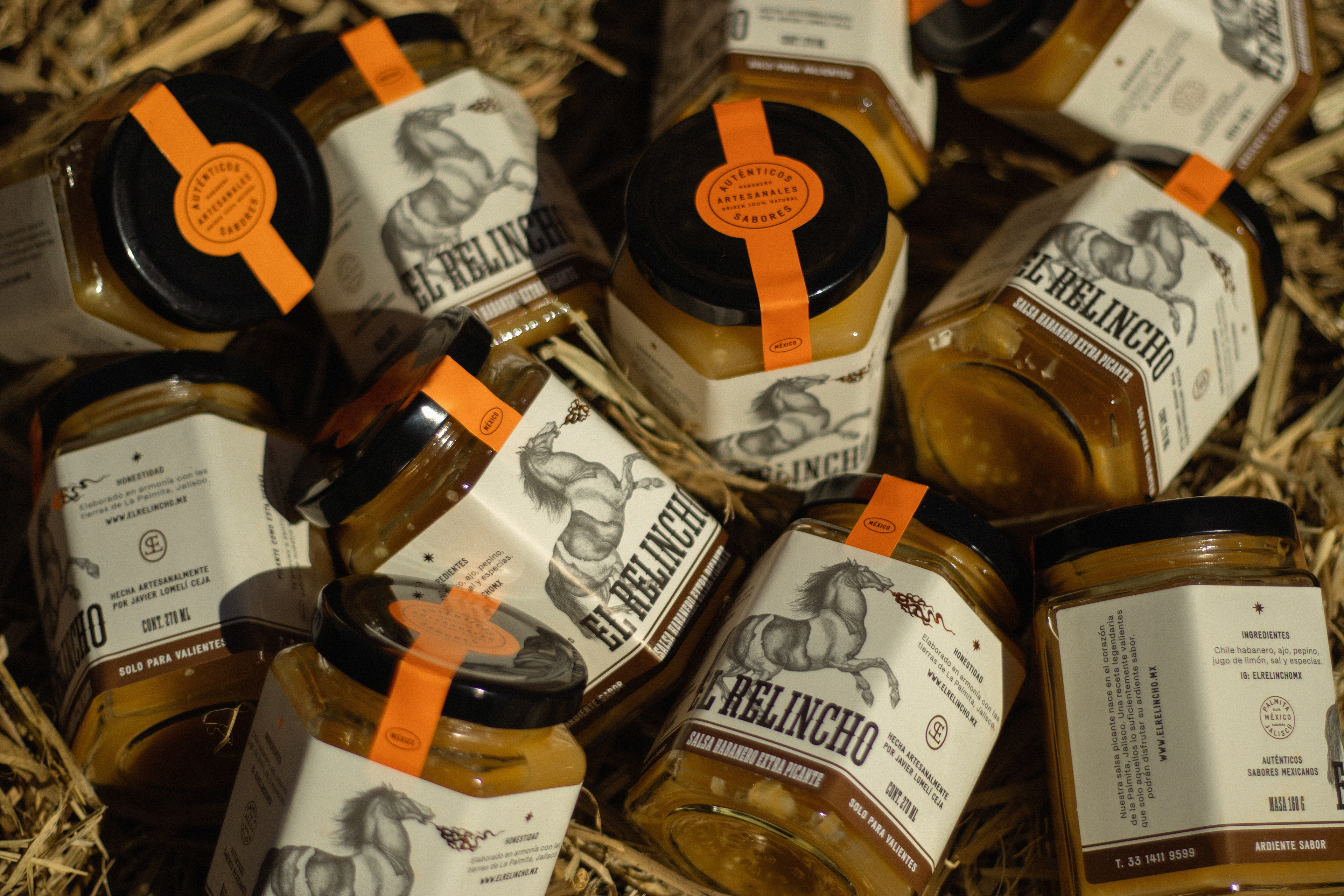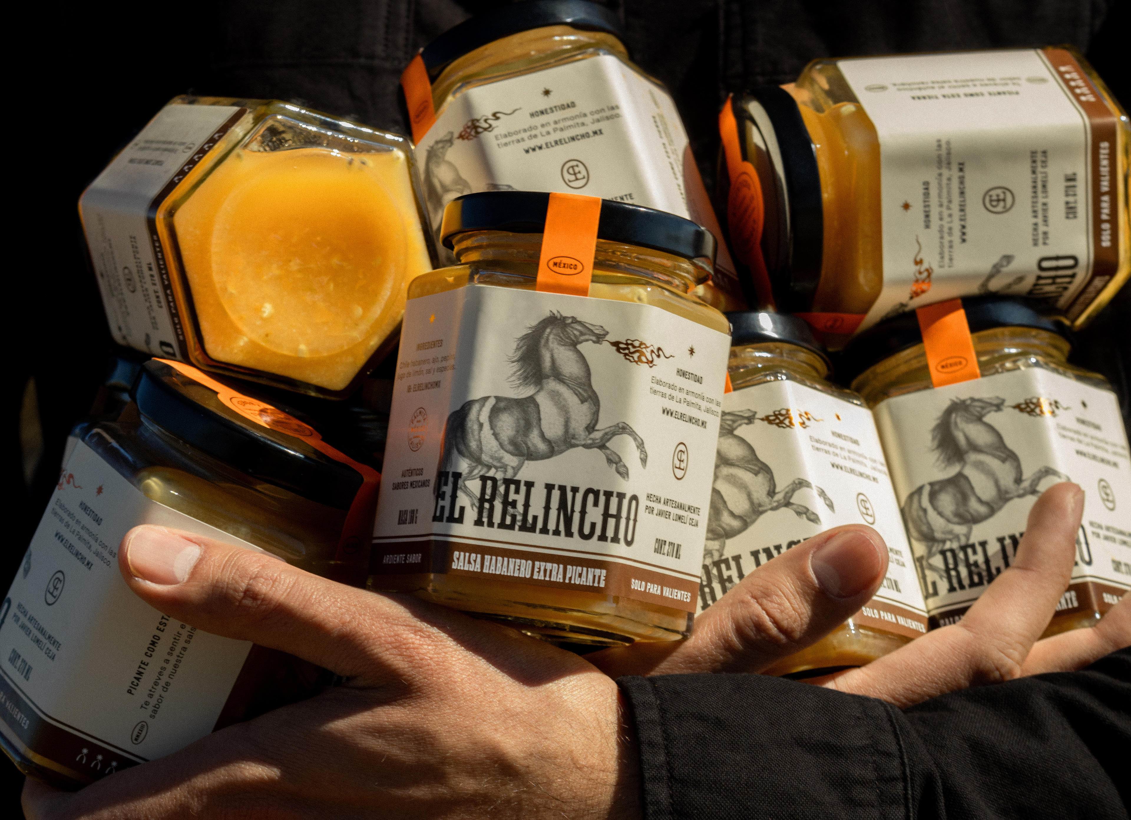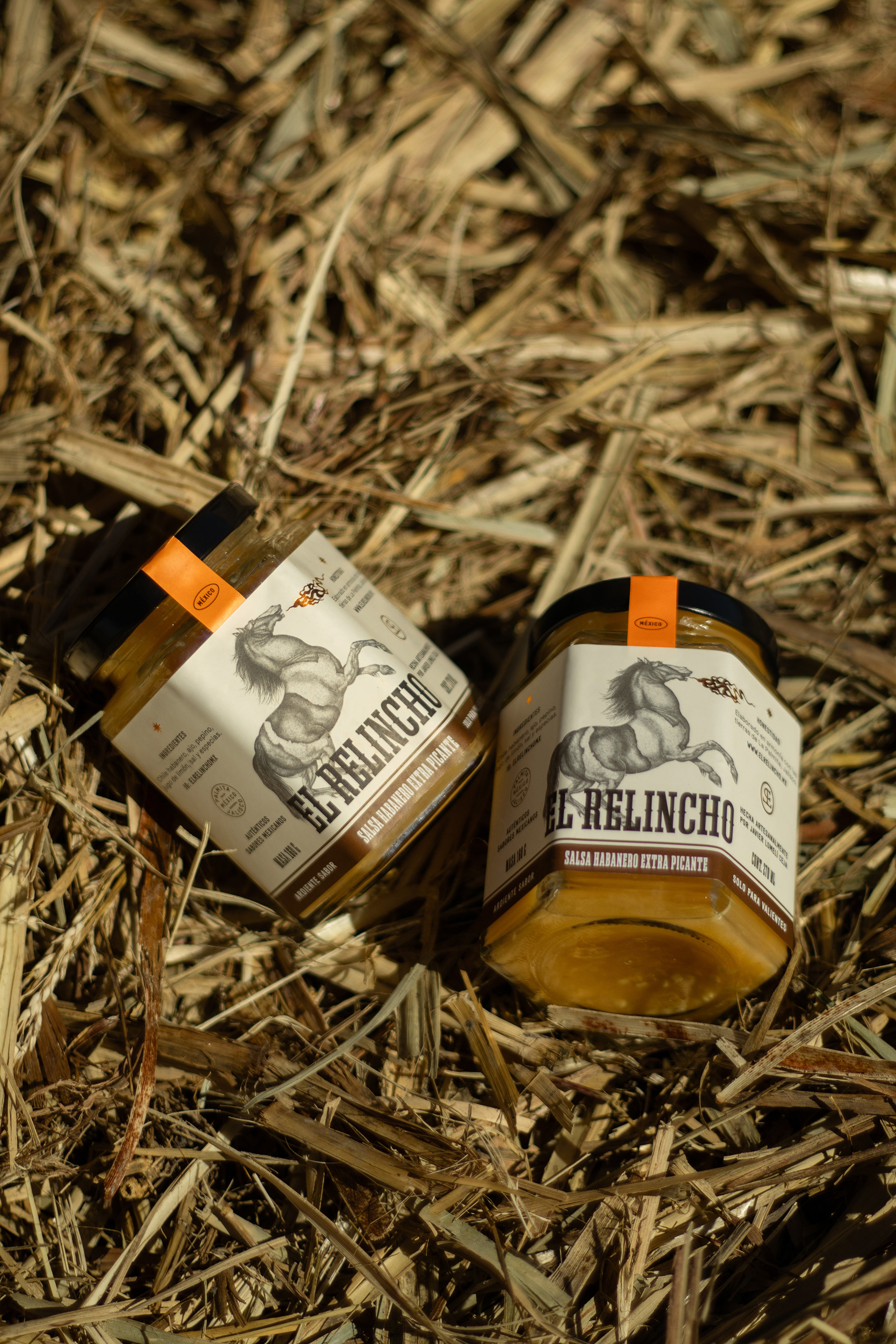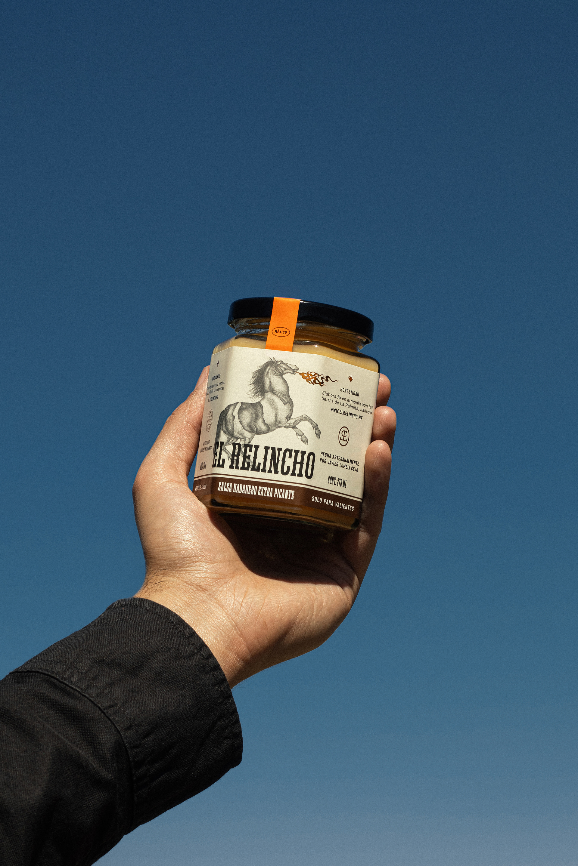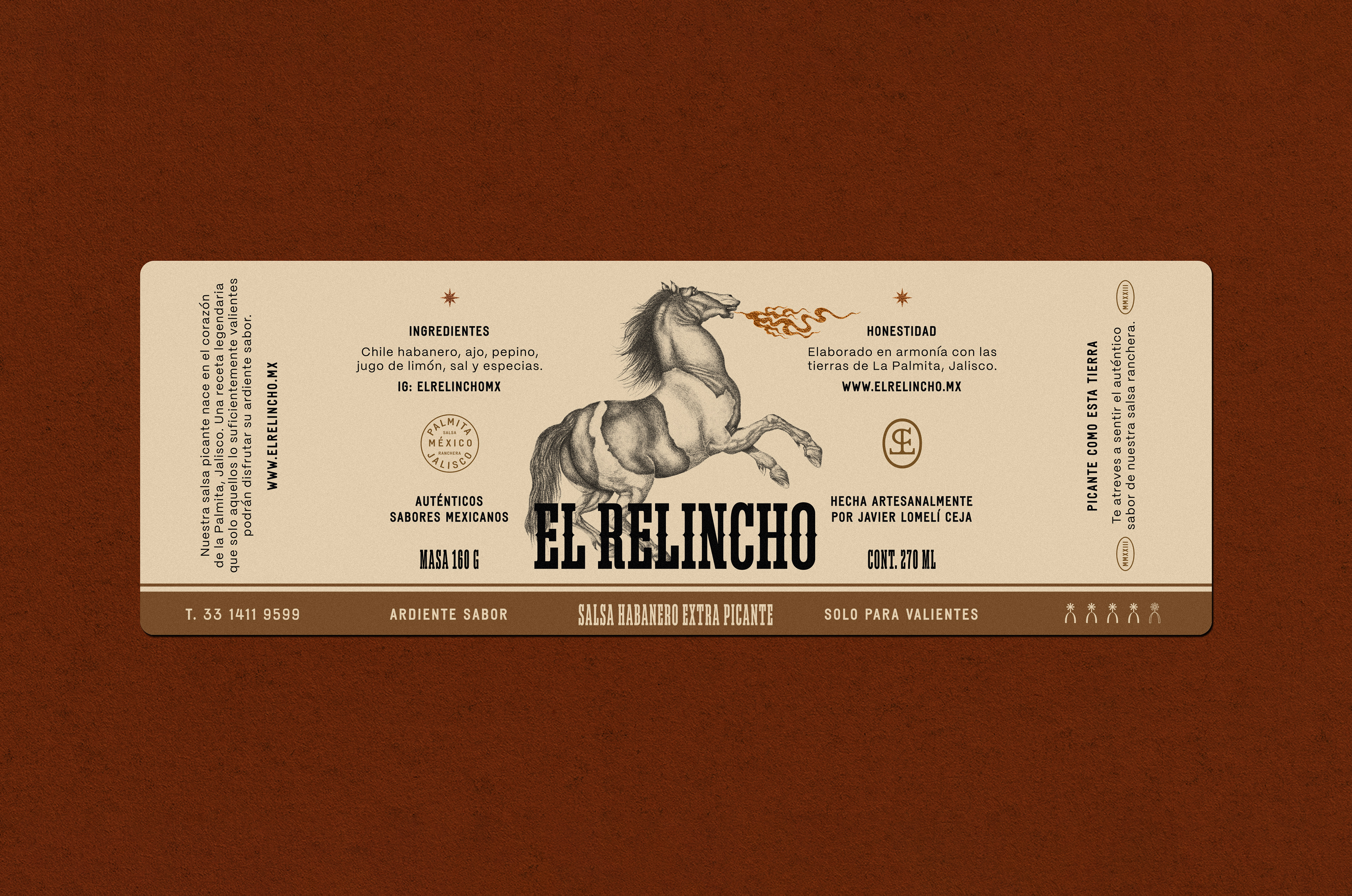 El Relincho es una salsa picante artesanal de habanero que nace en el corazón de La Palmita, Jalisco. Esta salsa captura el espíritu indomable y el legado vaquero de su creador Javier Lomelí Ceja, una creación emblemática que desafía los paladares más valientes y evoca la riqueza de las raíces mexicanas. En la búsqueda de reflejar esta herencia se creó una identidad visual basada en una ilustración del primer caballo de Javier: un pinto que en postura desafiante y acompañado de una llama simbolizan la intensidad de su sabor. Es así como el logotipo de El Relincho con una estética vaquera se justifica como una extensión natural de su identidad y origen al representar el espíritu de La Palmita, Jalisco, un pueblo donde los caballos, las sogas y la vida ranchera son el núcleo de las tradiciones familiares.